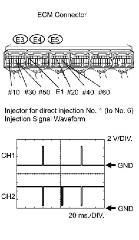 (a) Connect an oscilloscope to terminals #10 to #60 and E1 of the E3, E4 and E5 ECM harness side connectors.