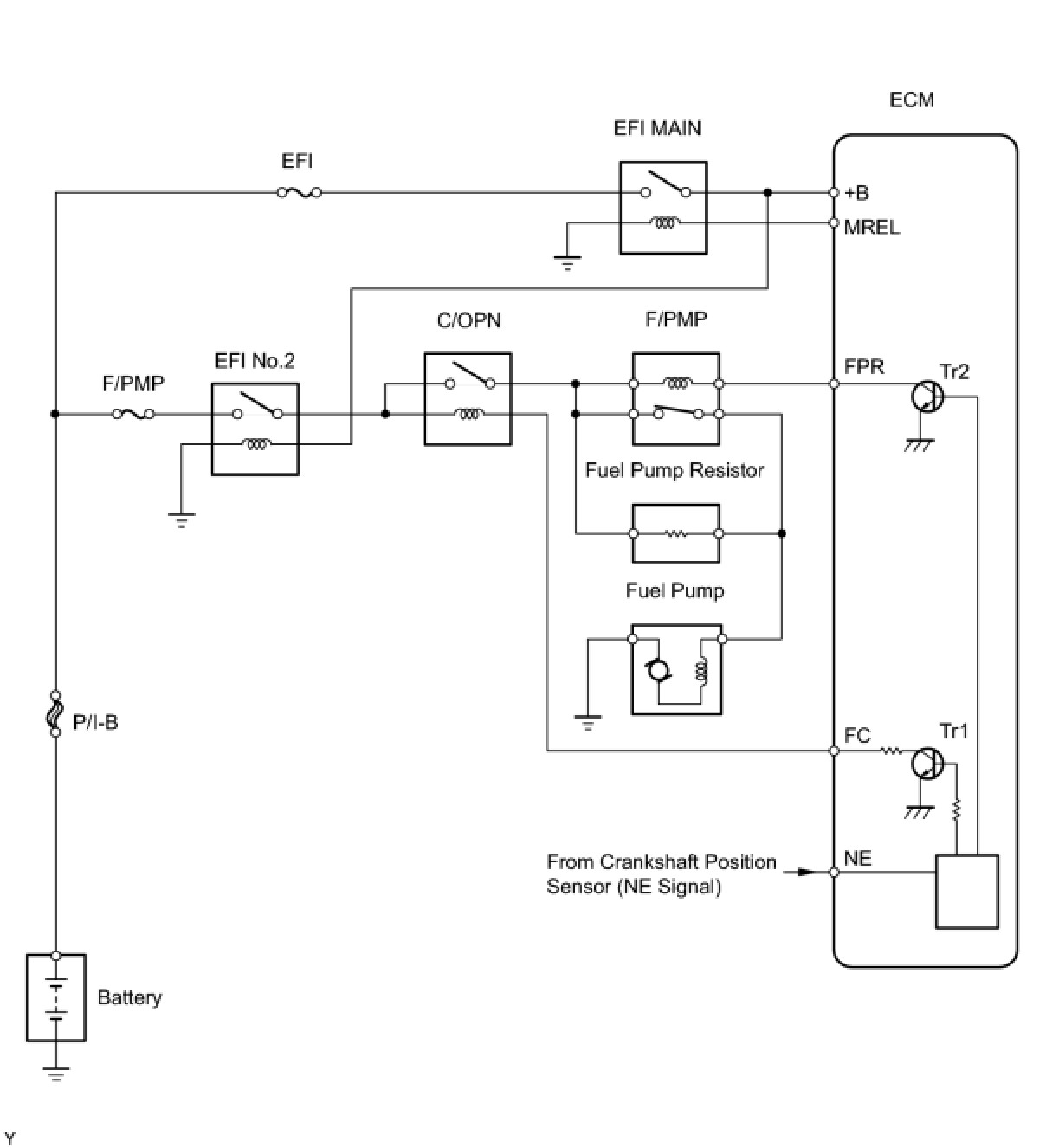 When the engine is cranked, a signal is sent from the ignition control ECU's STSW terminal to the ECM's STSW terminal. Then voltage travels from the ECM's STAR terminal through the park/neutral position switch to the STARTER relay coil. The STAR terminal also sends a signal to the STA terminal. When the STA signal and NE signal are input to the ECM, the ECM interior's Tr1 turns on, which causes power to be supplied to the C/OPN relay coil (C/OPN on). As a result, the F/PMP relay actuates, which causes the fuel pump to operate. If the engine is operating and NE signals are being output, the ECM interior's Tr1 is on (C/OPN on), and the fuel pump will continue operating. The fuel pump's has a high and low speed setting. When the engine is starting or operating with a heavy load, the ECM interior's Tr2 turns on to actuate the F/PMP relay so that the fuel pump operates at the high speed setting. When the engine is idling or operating with a light load, the Tr2 turns off, and current flows through the fuel pump resistor to the fuel pump so that the fuel pump operates at the low speed setting.