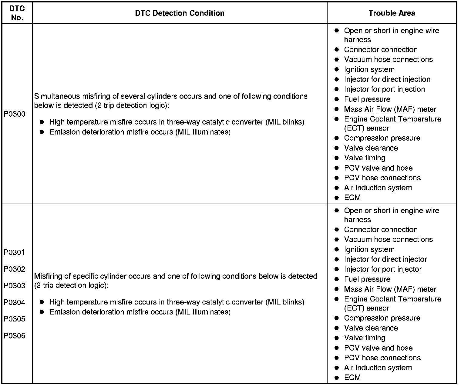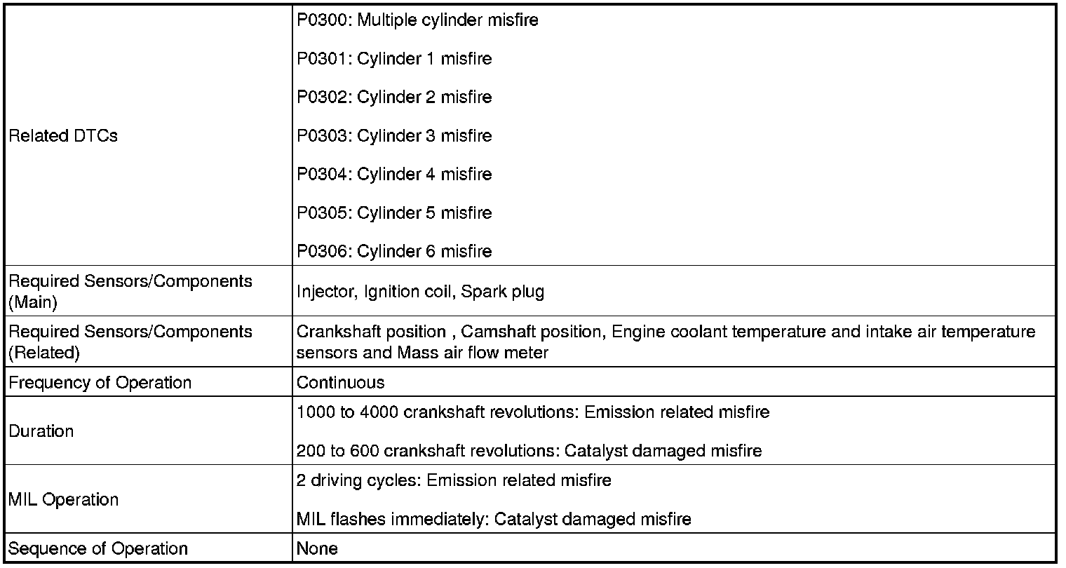 - For 6 and 8 cylinder engines, the ECM intentionally does not set the specific misfiring cylinder DTCs at high engine RPM. If misfires occur only in high engine RPM areas, only DTC P0300 is set.