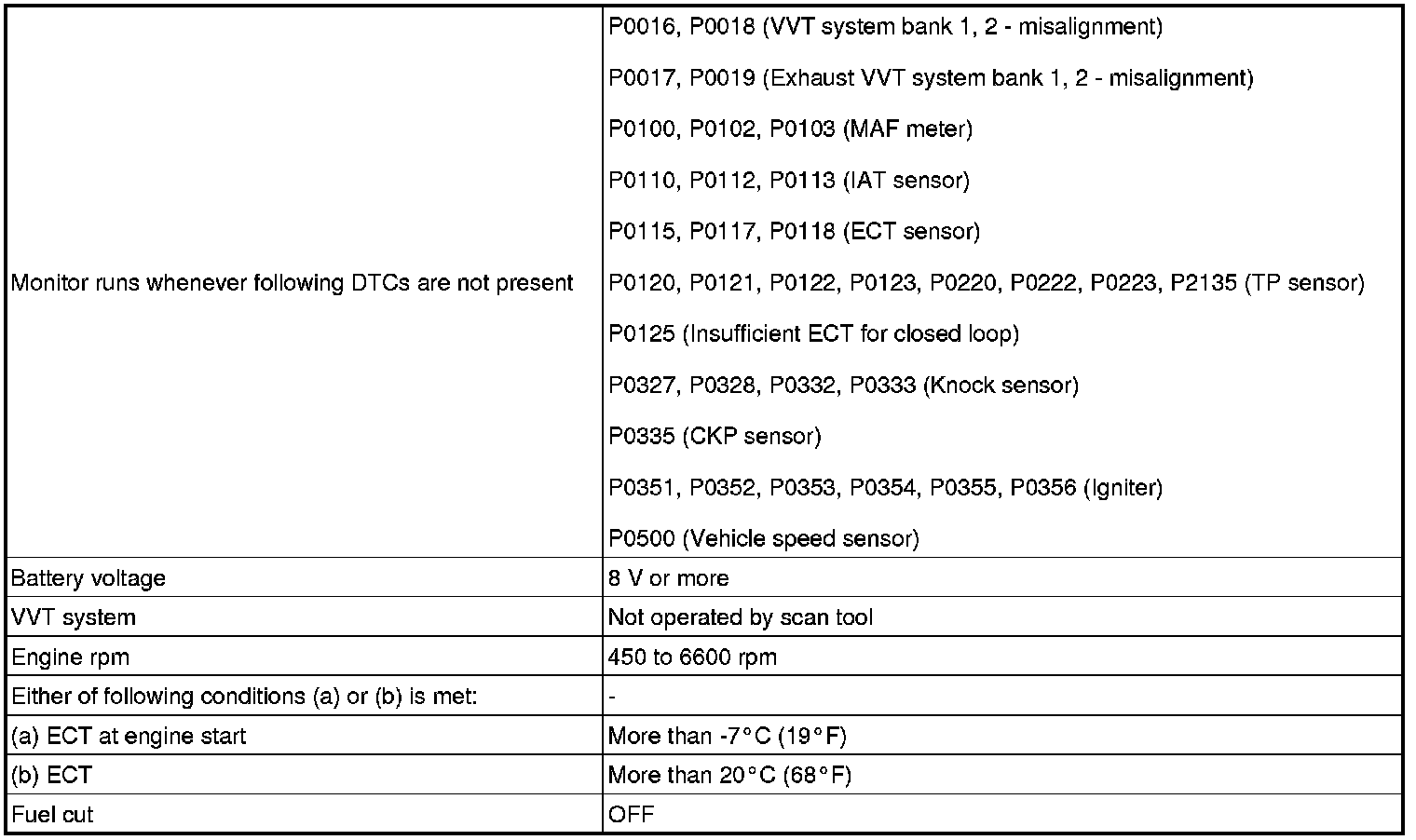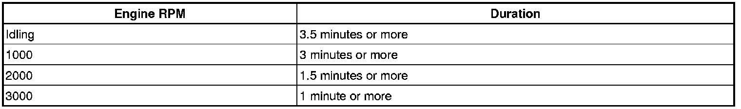 In order to store misfire DTCs, it is necessary to operate the vehicle for the period of time shown in the table below, using the Misfire RPM and Misfire Load in the Data List.