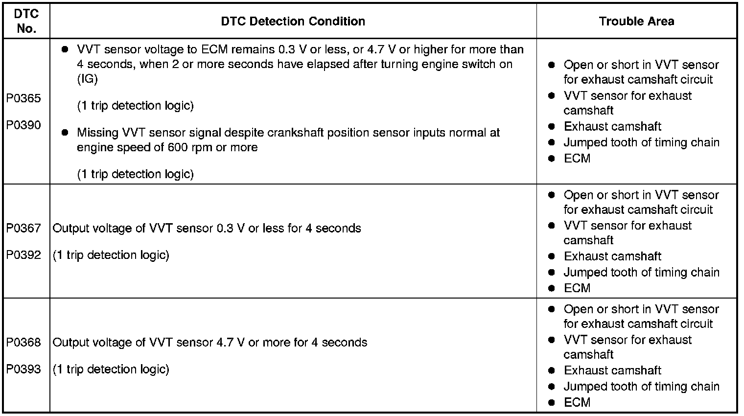 If no signal is transmitted by the VVT sensor despite the engine revolving, or the rotations of the camshaft and the crankshaft are not synchronized, the ECM interprets this as a malfunction of the sensor.