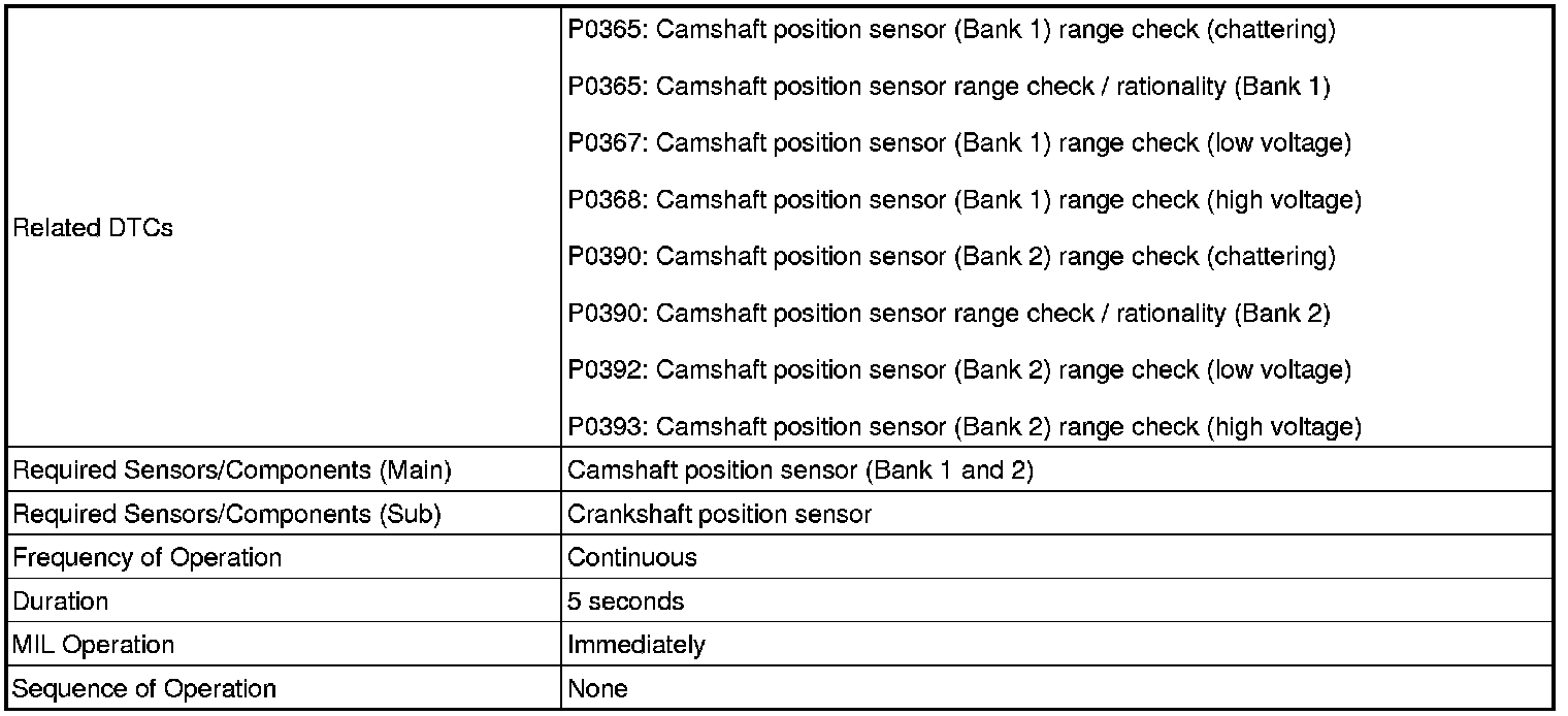 Camshaft Position Sensor Range Check (Chattering, Low voltage, High voltage) P0365, P0367, P0368, P0390, P0392 and P0393: