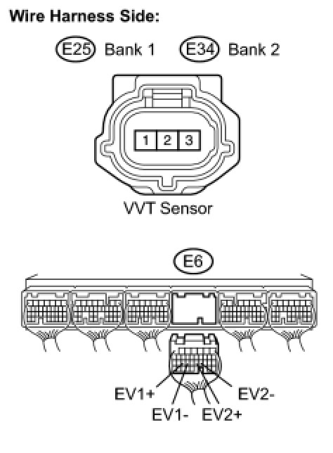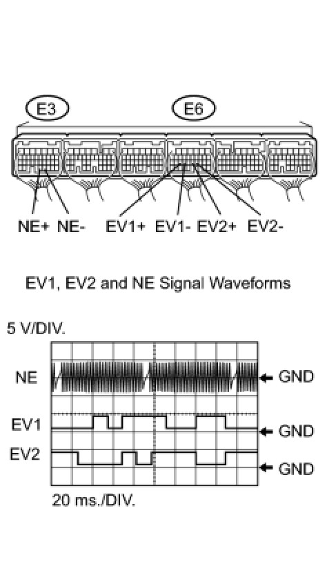 - EV1+ and EV2+ stand for the VVT sensor signal, and NE+ stands for the CKP sensor signal.