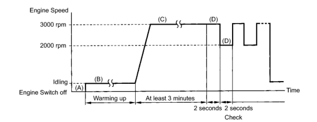 Perform the operation with the engine speeds and time durations described below prior to checking the waveforms of the A/F and HO2 sensors. This is performed in order to heat the sensors sufficiently to obtain the appropriate inspection results.