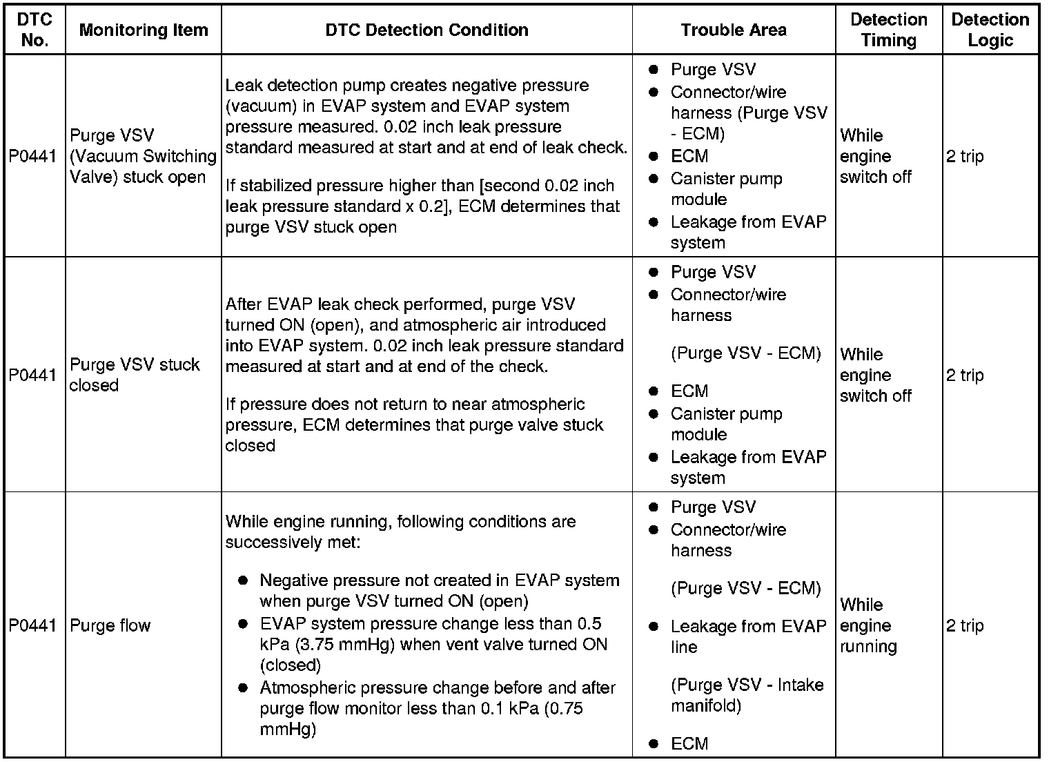 The vent valve is turned ON (closed) and the EVAP pressure is then measured. If the variation in the pressure is less than 0.5 kPa (3.75 mmHg), the ECM interprets this as the purge VSV being stuck closed, and illuminates the MIL and sets DTC P0441 (2 trip detection logic).