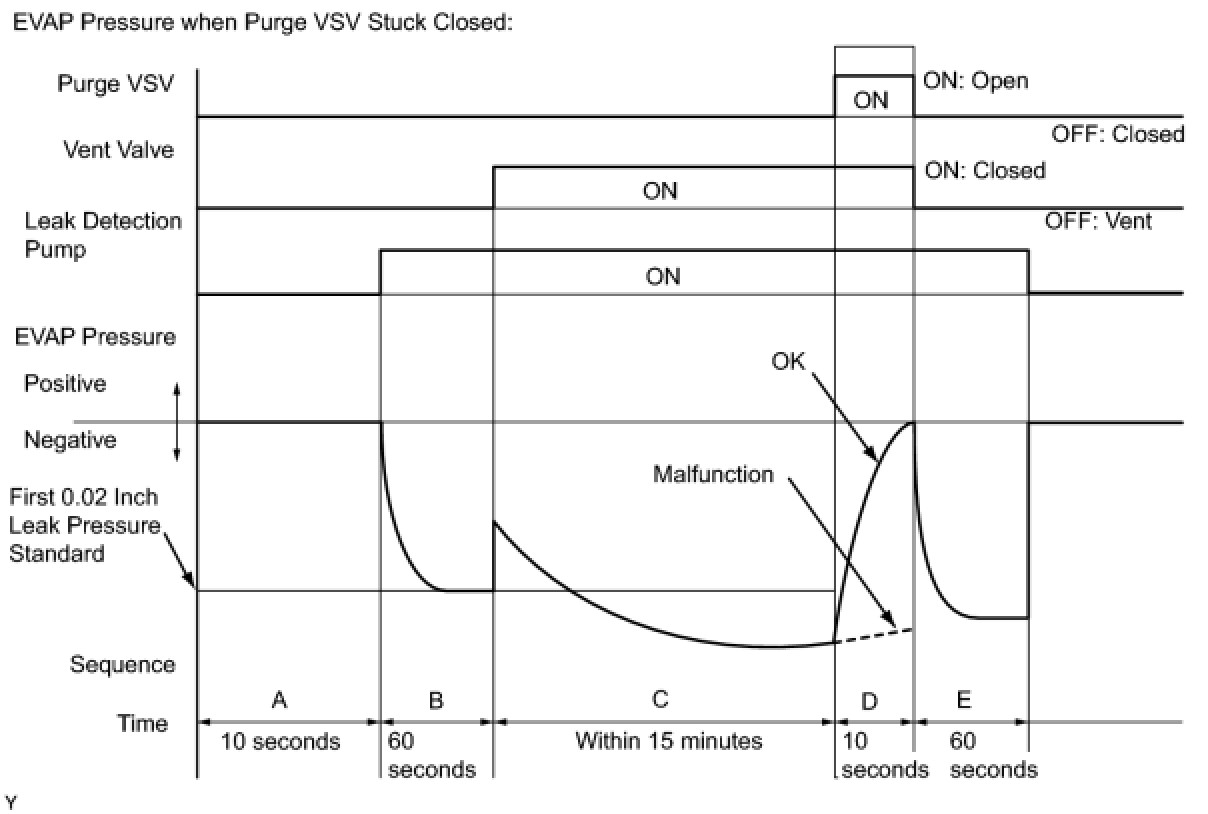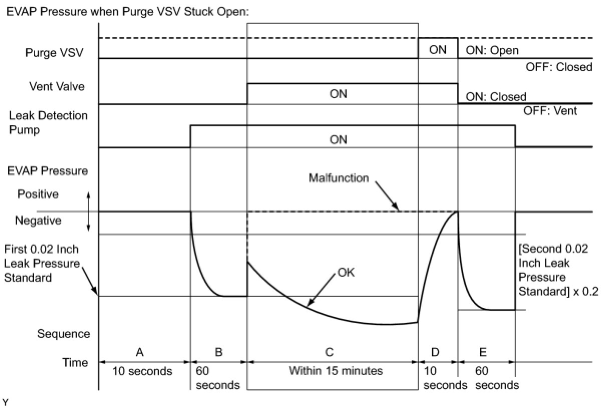 In operation C, the leak detection pump creates negative pressure (vacuum) in the EVAP (Evaporative Emission) system. The EVAP system pressure is then measured by the ECM using the canister pressure sensor. If the stabilized system pressure is higher than [second 0.02 inch leak pressure standard x 0.2], the ECM interprets this as the purge VSV (Vacuum Switching Valve) being stuck open. The ECM illuminates the MIL and sets the DTC (2 trip detection logic).
