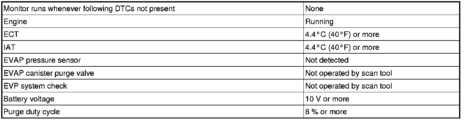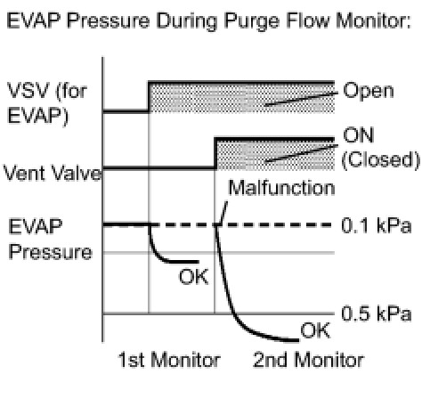 While the engine is running and the purge VSV (vacuum Switching Valve) is ON (open), the ECM monitors the purge flow by measuring the EVAP pressure change. If negative pressure is not created, the ECM begins the 2nd monitor.