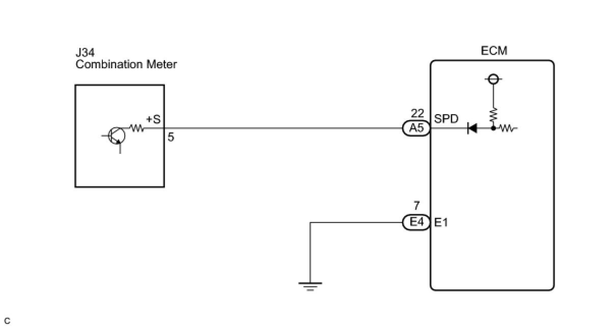 The speed sensor detects the wheel speed and sends the appropriate signals to the skid control ECU. The skid control ECU converts these wheel speed signals into a 4-pulse signal and outputs it to the ECM via the combination meter. The ECM determines the vehicle speed based on the frequency of these pulse signals.