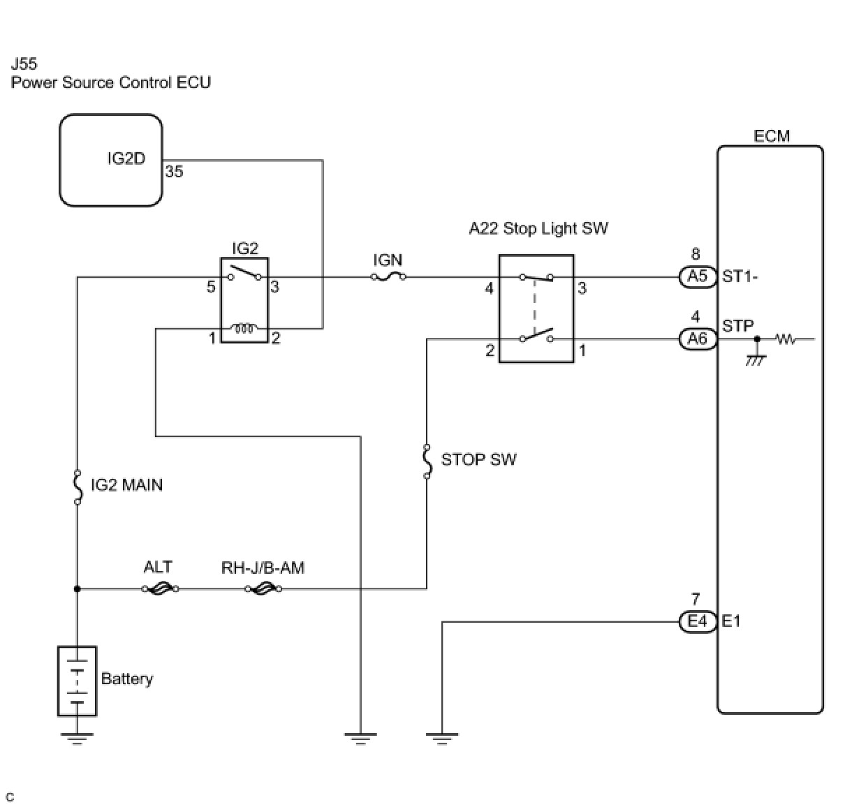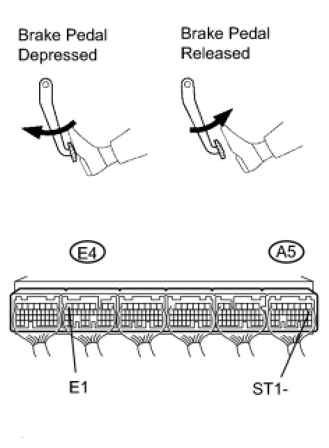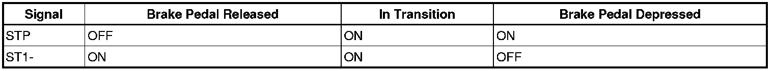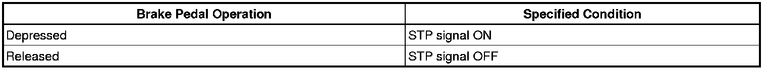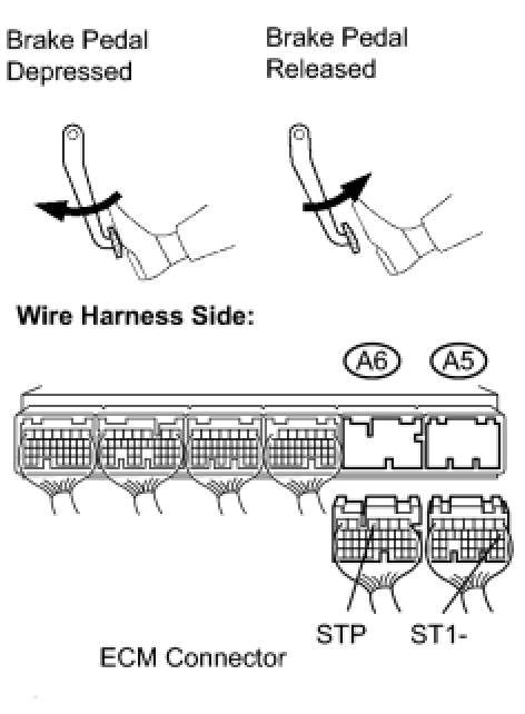 The stop light switch is a duplex system that transmits two signals: STP and ST1-. These two signals are used by the ECM to monitor whether or not the brake system is working properly. If the signals, which indicate the brake pedal is being depressed and released, are detected simultaneously, the ECM interprets this as a malfunction in the stop light switch and sets the DTC.