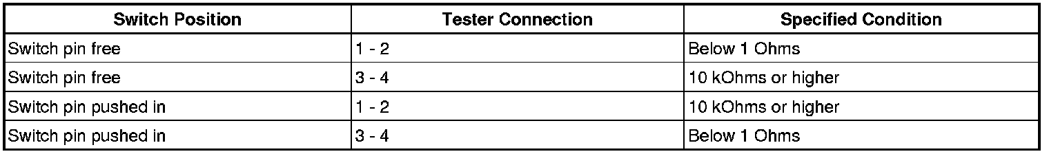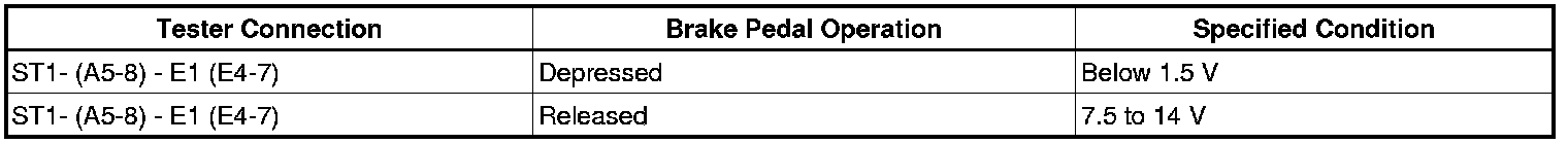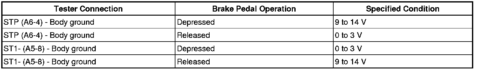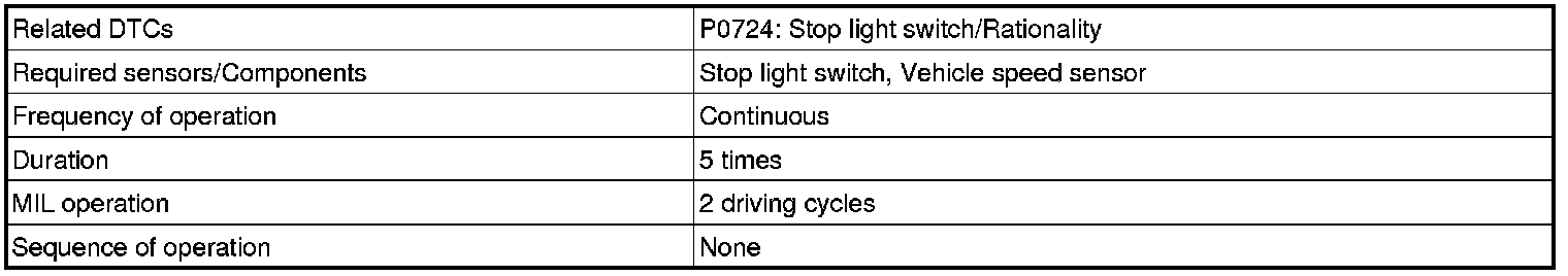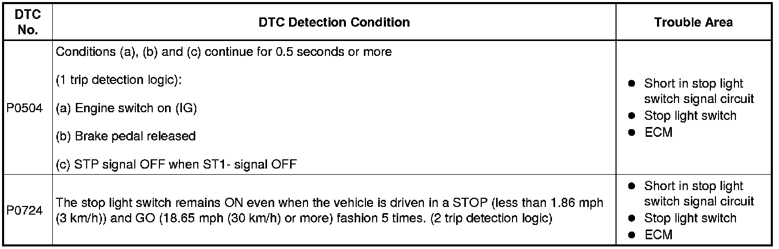 This DTC indicates that the stop light switch remains on. When the stop light switch remains ON during "stop and go" driving, the ECM interprets this as a fault in the stop light switch and the MIL comes on and the ECM stores the DTC. The vehicle must stop (less than 2 mph (3 km/h)) and go (19 mph (30 km/h) or more) 5 times for two driving cycles in order to detect a malfunction.