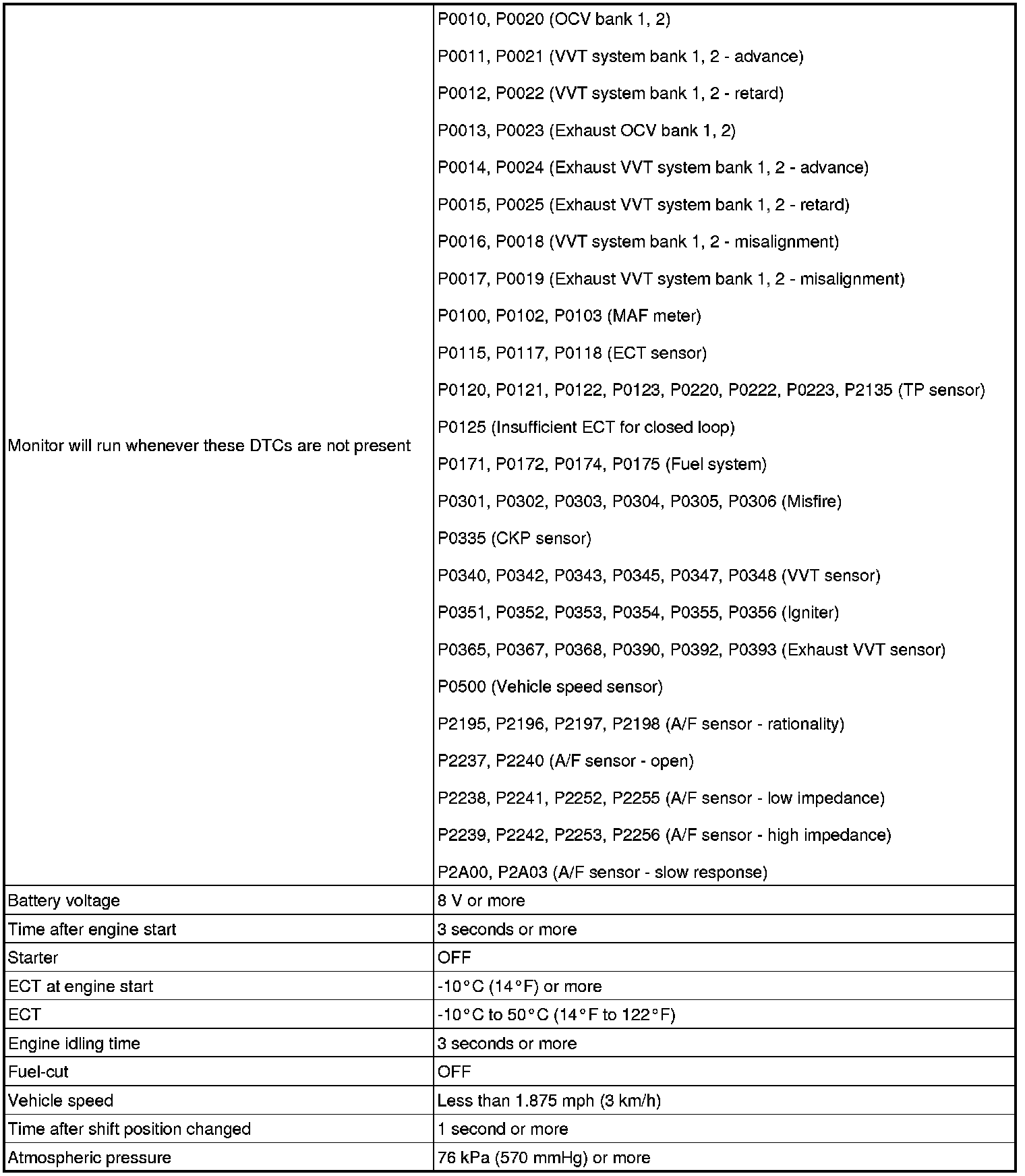 The ECM also monitors the ignition timing at cold start, and judges it to be incorrect when it is advanced to the same value for a warm engine for 5 seconds or more of the 10 second monitoring period.