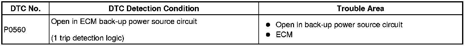 The battery supplies electricity to the ECM even when the engine switch is off. This power allows the ECM to store data such as DTC history, freeze frame data and fuel trim values. If the battery voltage falls below a minimum level, these memories are cleared and the ECM determines that there is a malfunction in the power supply circuit. When the engine is next started, the ECM will illuminate the MIL and sets the DTC.
