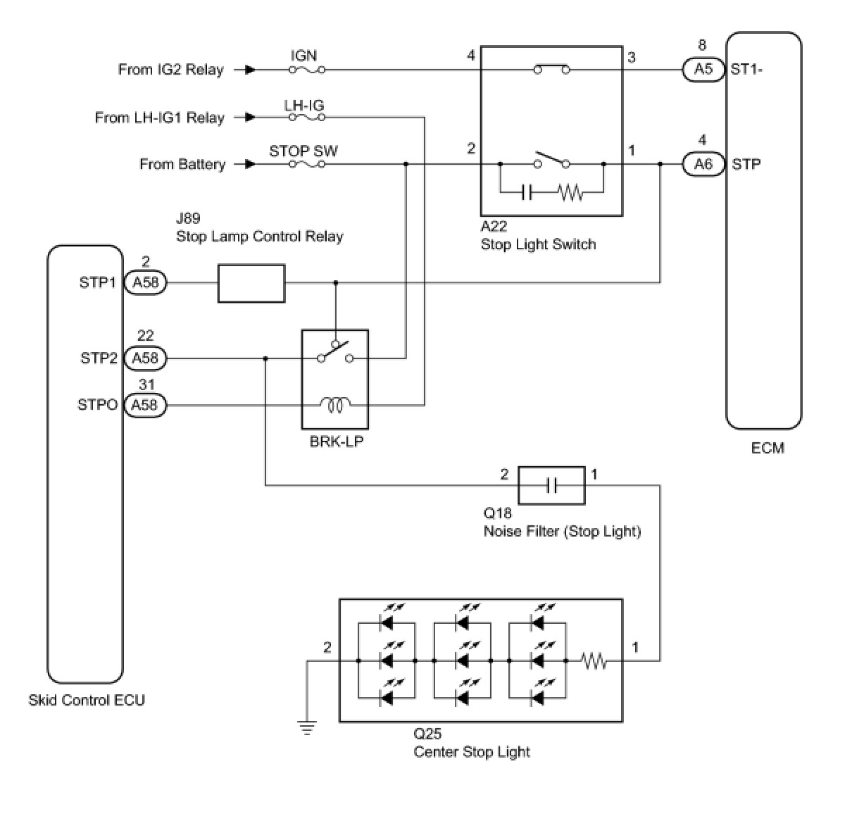 When the brake pedal is depressed, the stop light switch sends a signal to the ECM. When the ECM receives this signal, it cancels the cruise control. The fail-safe function operates to enable normal driving even if there is a malfunction in the stop light signal circuit. Cruise control cancellation occurs when voltage is applied to terminal STP. When the brake is applied, voltage is normally applied to terminal STP of the ECM through the STOP SW fuse and the stop light switch, and the ECM turns the cruise control off.