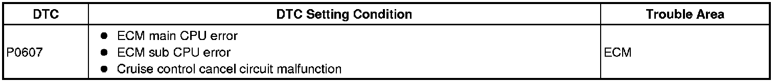 The ECM also monitors the cruise control cancel circuit. If this circuit malfunctions, the ECM will set a DTC immediately (MIL is not illuminated).