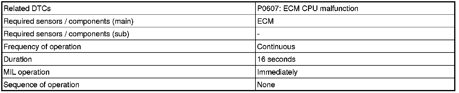 The ECM continuously monitors its main and sub CPUs. This self-check ensures that the ECM functioning properly. If output from the CPUs are different and deviate from the standards, the ECM will illuminate the MIL and set a DTC immediately.