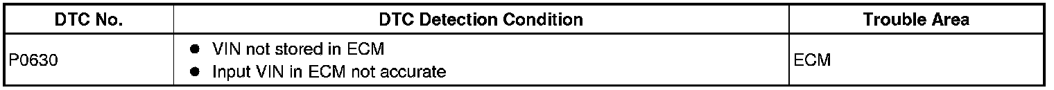 DTC P0630 is set when the Vehicle Identification Number (VIN) is not stored in the Engine Control Module (ECM) or the input VIN is not accurate. Input the VIN with Techstream.