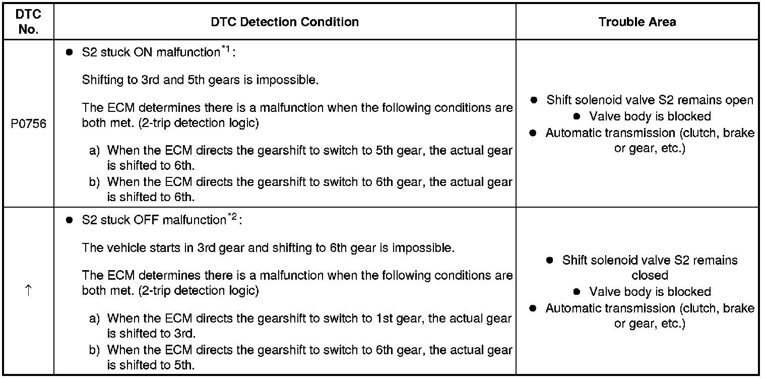 This DTC indicates "stuck ON malfunction" or "stuck OFF malfunction" of the shift solenoid valve S2.