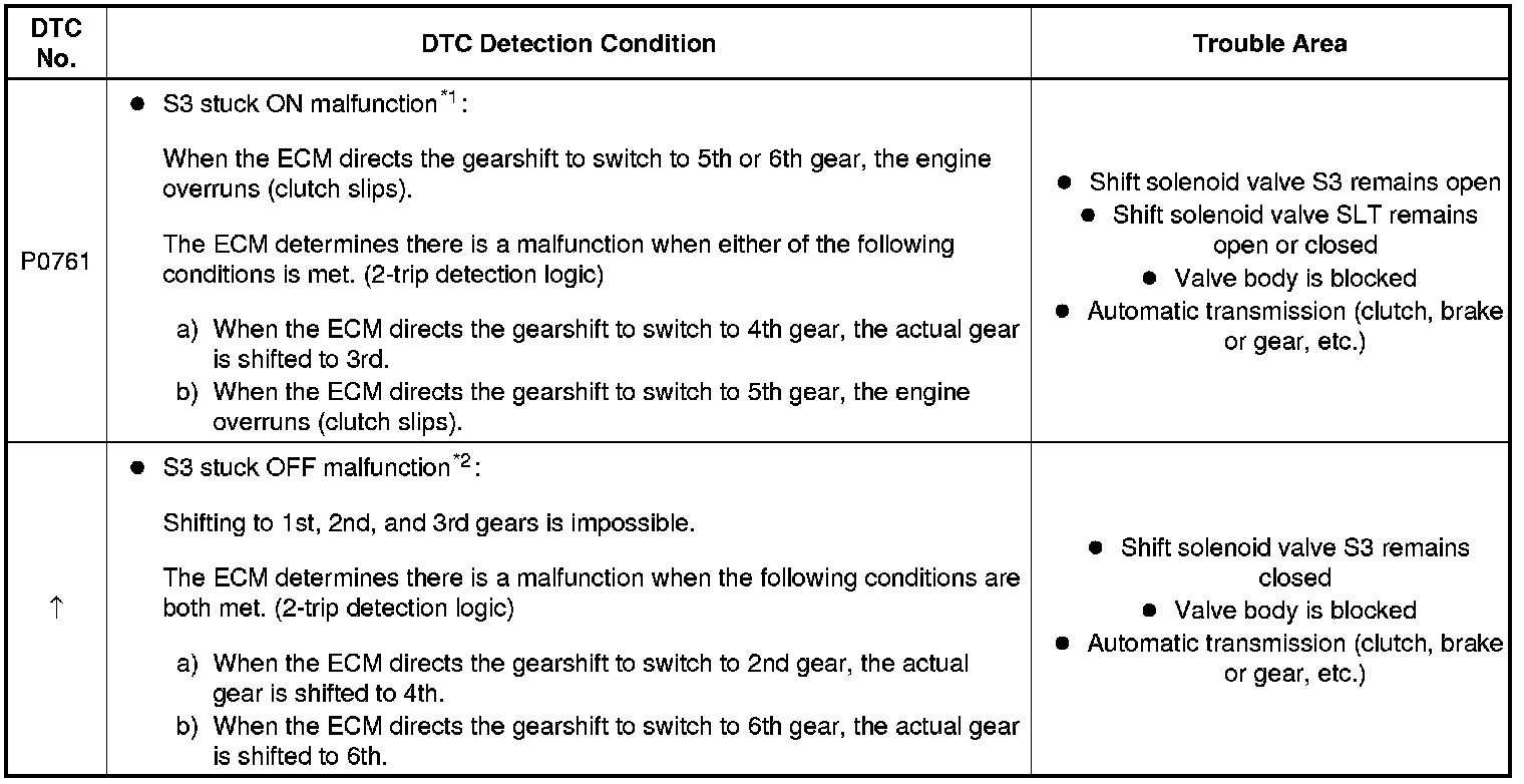 This DTC indicates "stuck ON malfunction" or "stuck OFF malfunction" of the shift solenoid valve S3.