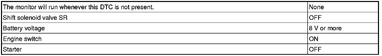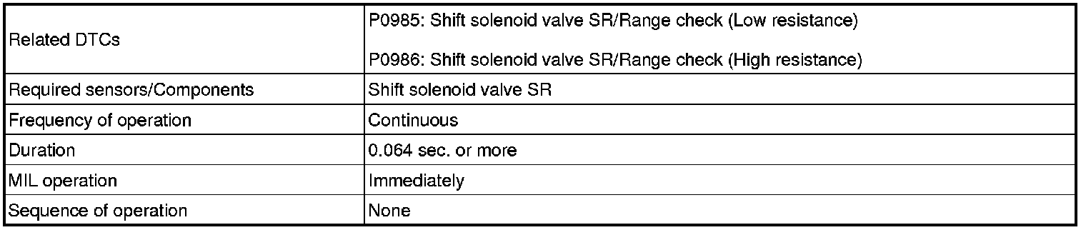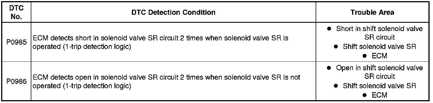 These DTCs indicate an open or short in the shift solenoid valve SR circuit. When there is an open or short circuit in any shift solenoid valve circuit, the ECM detects the problem and illuminates the MIL and stores the DTC. When the shift solenoid valve SR is on, if resistance is 8 Ohms or less, the ECM determines there is a short in the shift solenoid valve SR circuit.