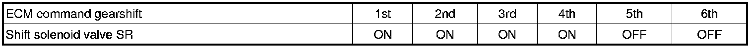 Shifting from 1st to 6th is performed in combination with "ON" and "OFF" operation of the shift solenoid valves SL1, SL2, S1, S2, S3, S4 and SR which is controlled by the ECM. If an open or short circuit occurs in either of the shift solenoid valves, the ECM controls the remaining normal shift solenoid valve to allow the vehicle to be operated smoothly. (In case of an open or short circuit, the ECM stops sending current to the circuit.) Fail safe function Fail-Safe Chart.