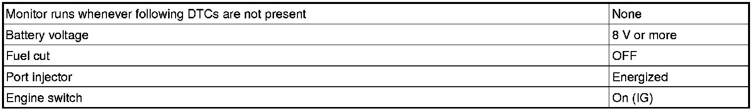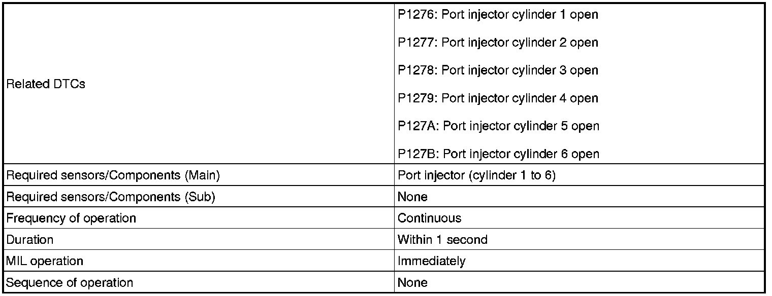 The ECM monitors the injection control of the port injector. If a malfunction is detected in the port injector circuit, the ECM cancels the injection control for the corresponding cylinder and turns on the check engine warning light.