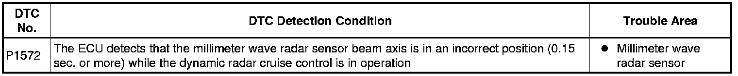 This DTC is output when the scanning angle of the millimeter wave radar sensor is incorrect. This DTC is also output when the millimeter wave radar sensor beam axis is determined to be in an incorrect position.