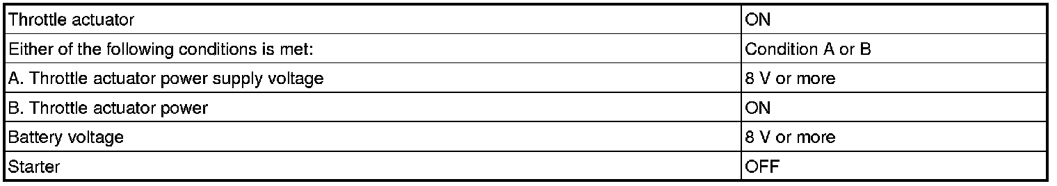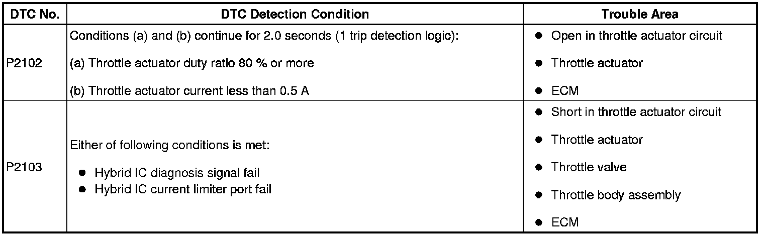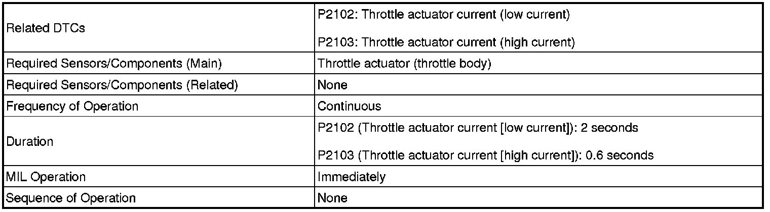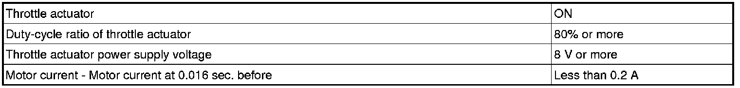 When the electrical current is less than 0.5 A and the throttle actuator duty ratio exceeds 80 %, the ECM interprets this as the current being outside the standard range, and illuminates the MIL and sets a DTC.