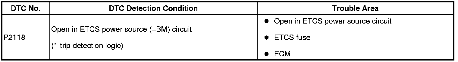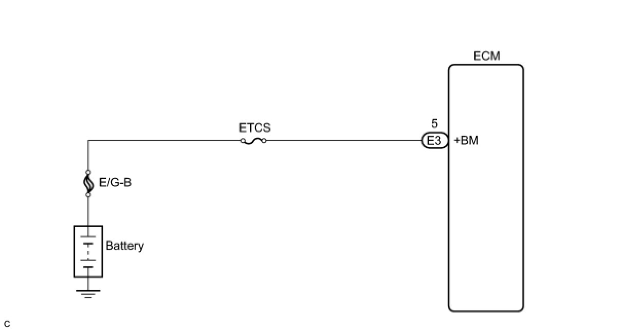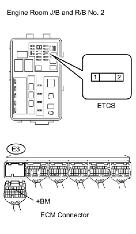 The ETCS (Electronic Throttle Control System) has a dedicated power supply circuit. When the monitored voltage (+BM) is low (less than 4 V), the ECM determines that there is a malfunction in the ETCS and cuts off the current to the throttle actuator.