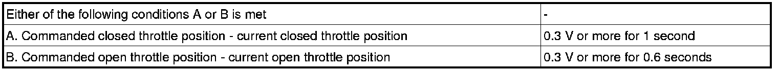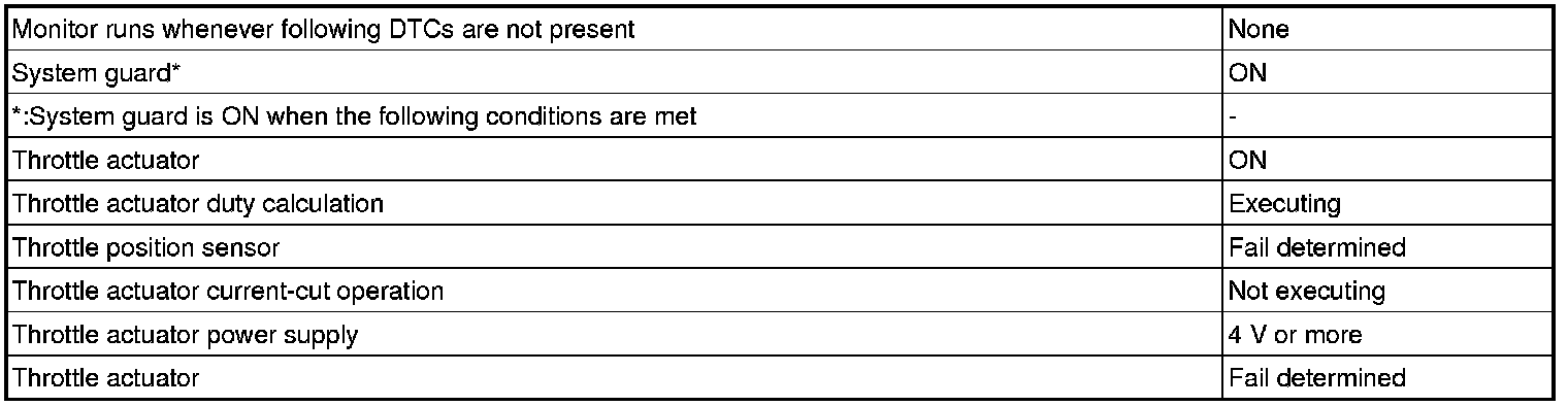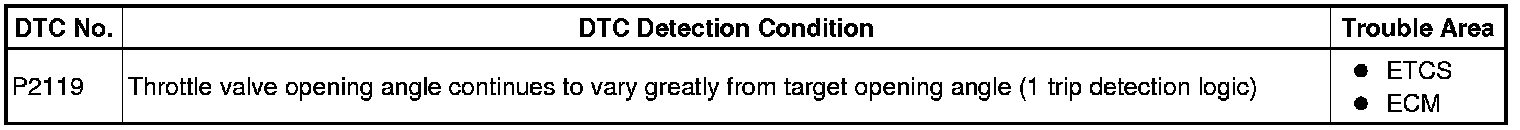 The ECM determines the actual opening angle of the throttle valve from the TP sensor signal. The actual opening angle is compared to the target opening angle commanded by the ECM. If the difference between these two values is outside the standard range, the ECM interprets this as a malfunction in the ETCS. The ECM then illuminates the MIL and sets the DTC.