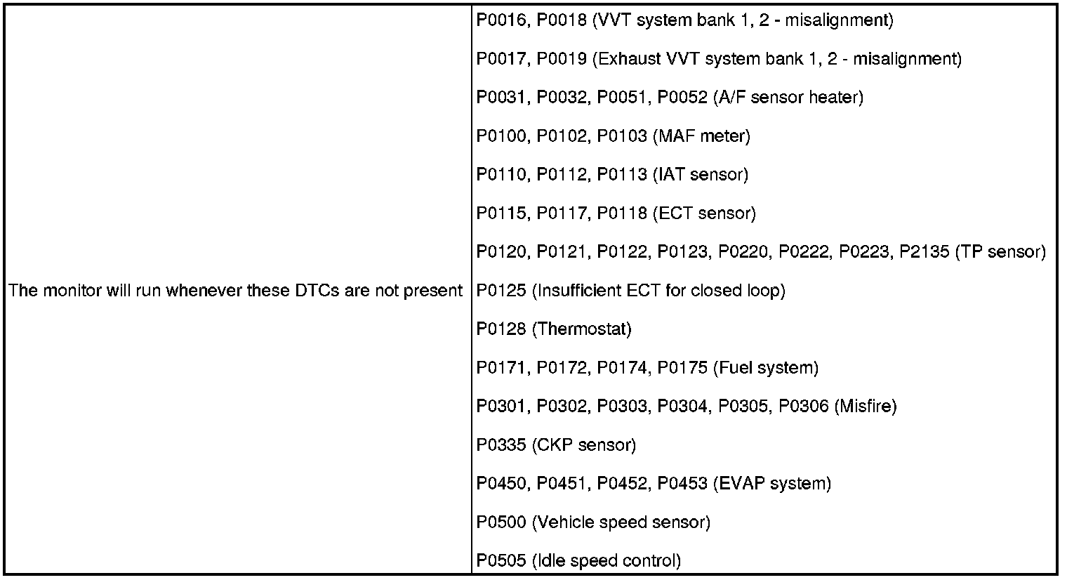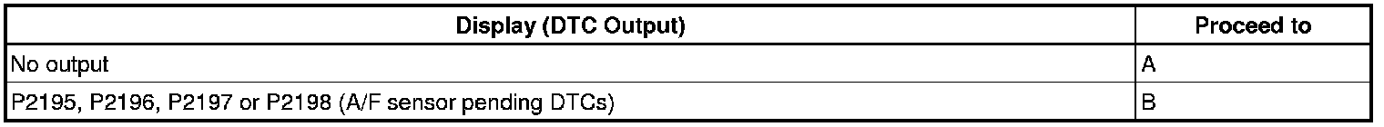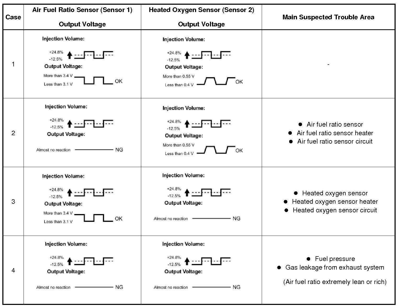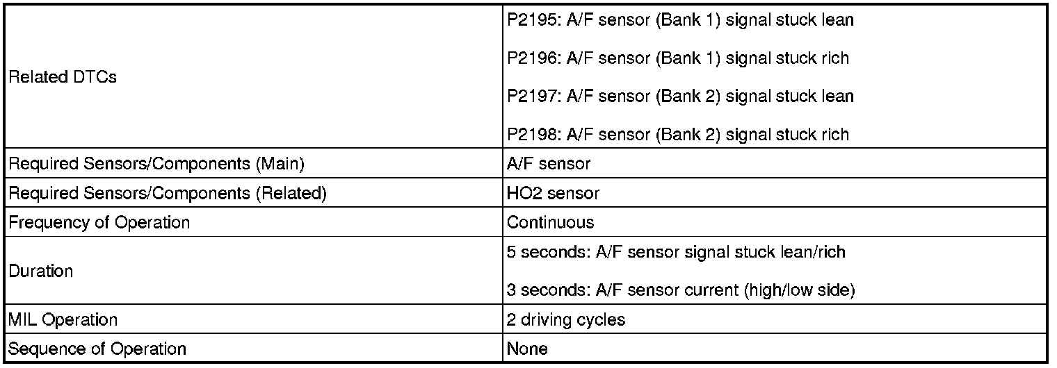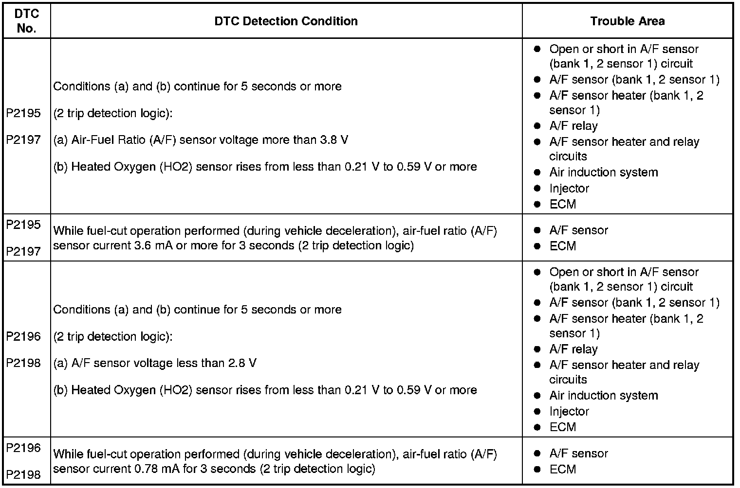 If the A/F sensor voltage output is less than 2.8 V (very rich condition) for 5 seconds, despite the HO2 sensor voltage output fails from 0.59 V or more to less than 0.21 V, the ECM sets DTC P2196 or P2198. Alternatively, if the A/F sensor voltage output is more than 3.8 V (very lean condition) for 5 seconds, despite the HO2 sensor voltage rises from less than 0.21 V to 0.59 V or more, DTC P2195 or P2197 is set.