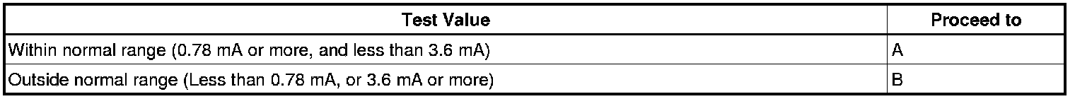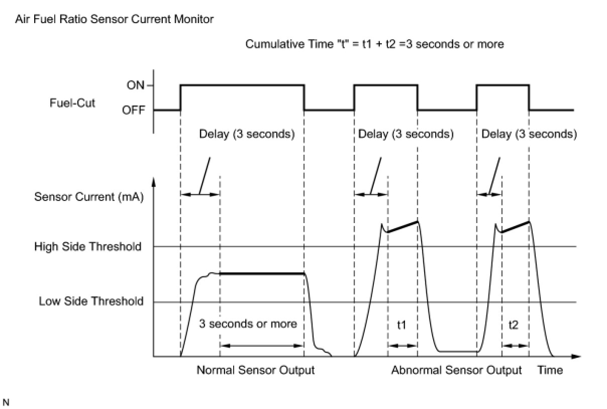 If the A/F sensor output is 3.6 mA or more for more than 3 seconds of cumulative time, the ECM interprets this as a malfunction in the A/F sensor and sets DTC P2195 or P2197 (high-side stuck). If the A/F sensor output is 0.78 mA or less for more than 3 seconds of cumulative time, the ECM sets DTC P2196 or P2198 (low-side stuck).