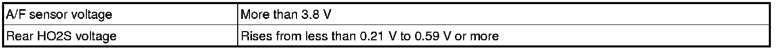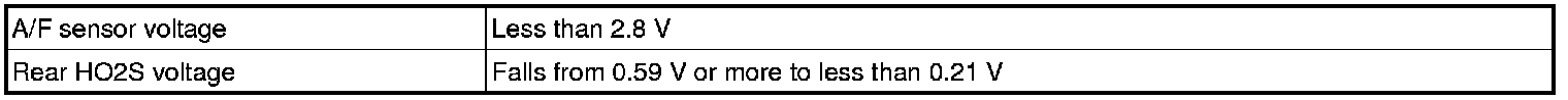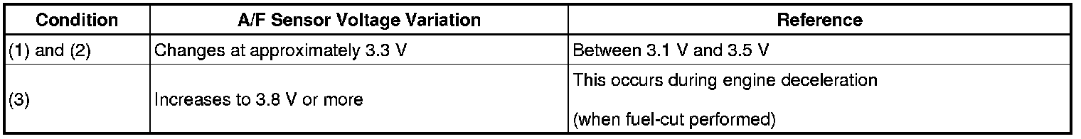 The output voltage of the A/F sensor may be below 2.8 V during fuel enrichment. For the vehicle, this translates to a sudden increase in speed with the accelerator pedal fully depressed when trying to overtake another vehicle. The A/F sensor is functioning normally.