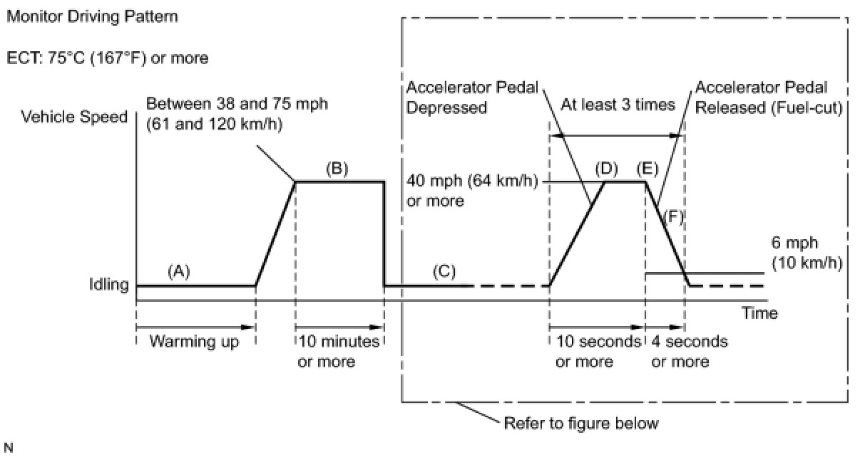 10 Accelerate the vehicle to 40 rpm (64 km/h) or more by depressing the accelerator pedal for at least 10 seconds (Procedure "E").