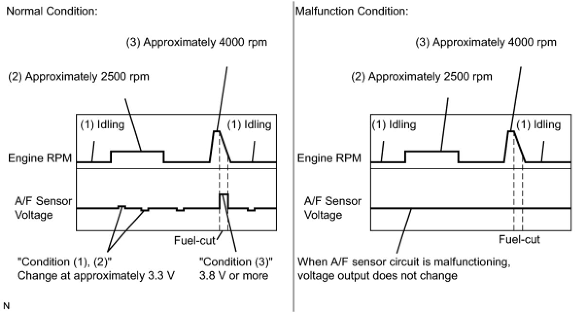 - If the output voltage of the A/F sensor remains at approximately 3.3 V (see Malfunction Condition diagram) under any conditions, including those above, the A/F sensor may have an open circuit. (this will also happen if the A/F sensor heater has an open circuit.)