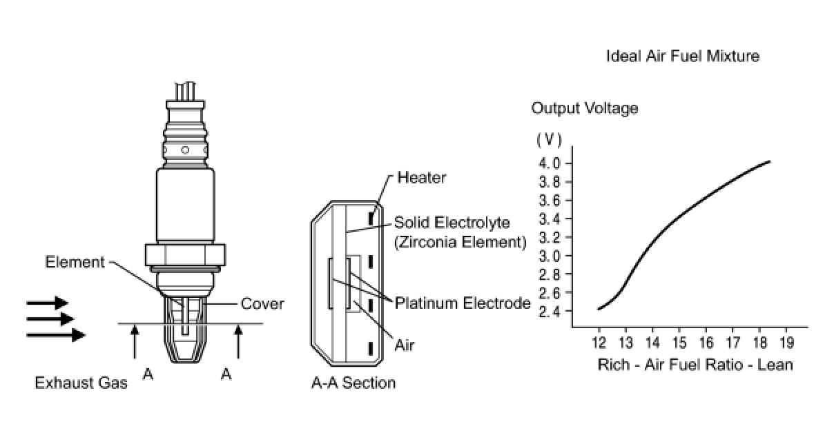 The A/F sensor generates voltage* that corresponds to the actual air-fuel ratio. This sensor voltage is used to provide the ECM with feedback so that it can control the air-fuel ratio. The ECM determines the deviation from the stoichiometric air-fuel ratio level, and regulates the fuel injection time. If the A/F sensor malfunctions, the ECM is unable to control the air-fuel ratio accurately.