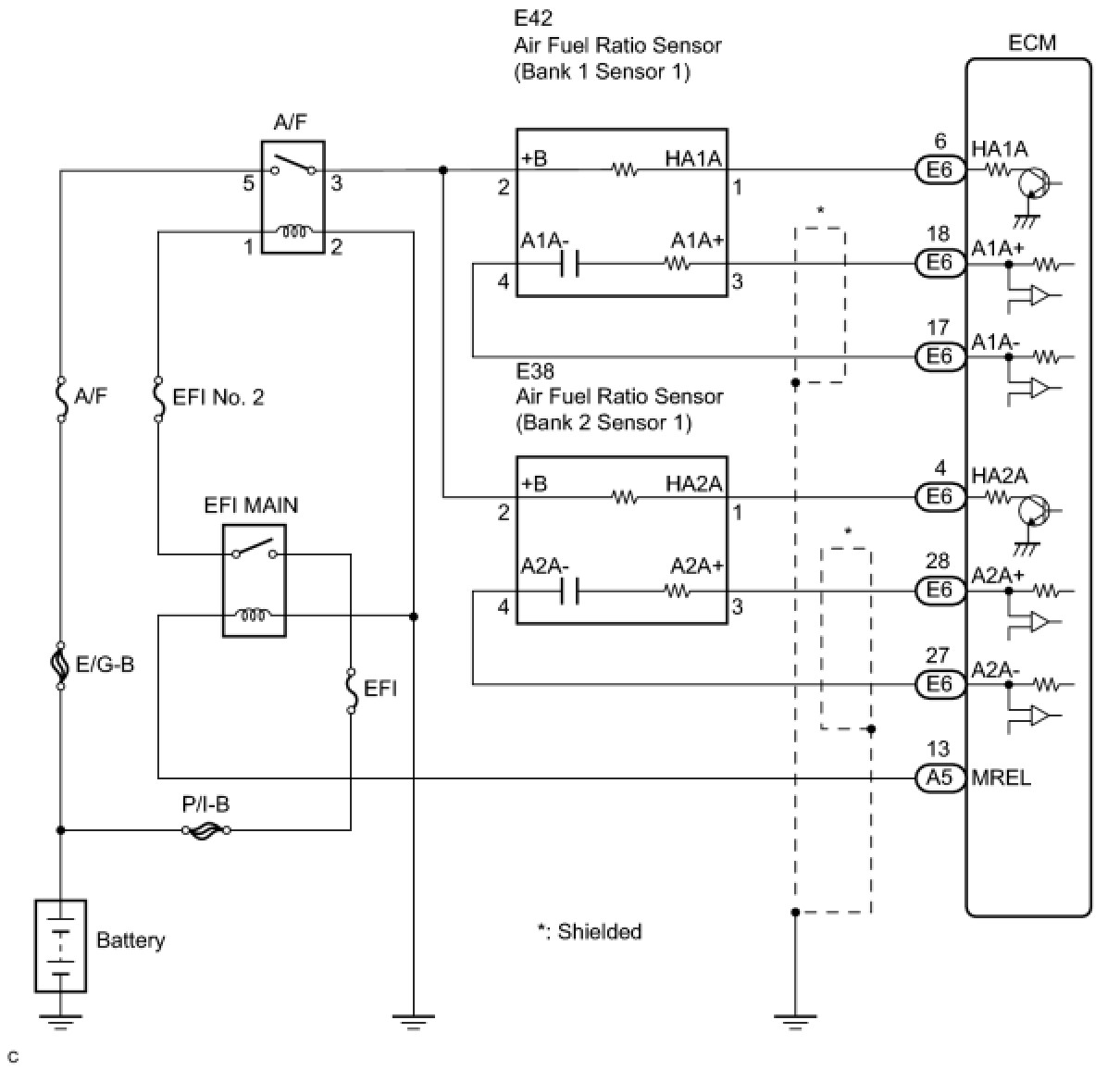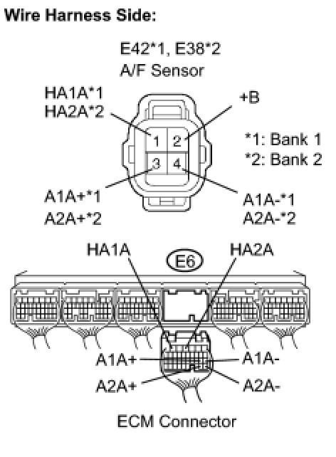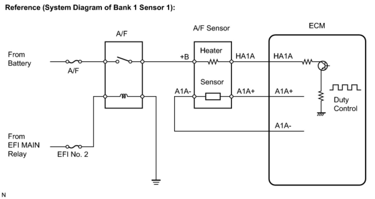 - The ECM regulates the voltages at the A1A+, A2A+, A1A- and A2A- terminals of the ECM to a constant level. Therefore, the A/F sensor output voltage cannot be confirmed without using Techstream.