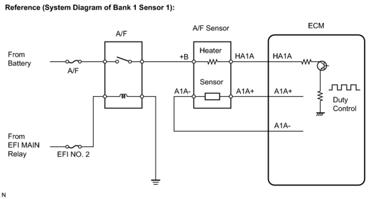 Depending on the engine operating conditions, the heater heats the sensor elements to activate them. Battery voltage is applied to the heater, the sensor ground is controlled by the ECM using a duty ratio.