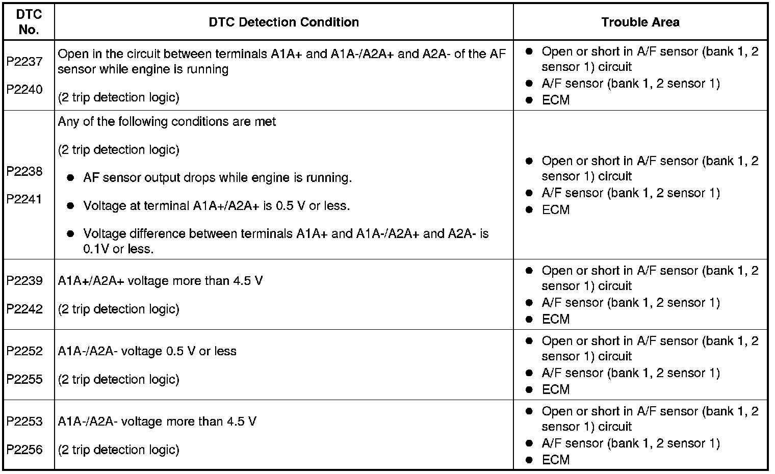A/F sensor - short circuit between A1A+ and GND/A2A+ and GND P2238 and P2241: