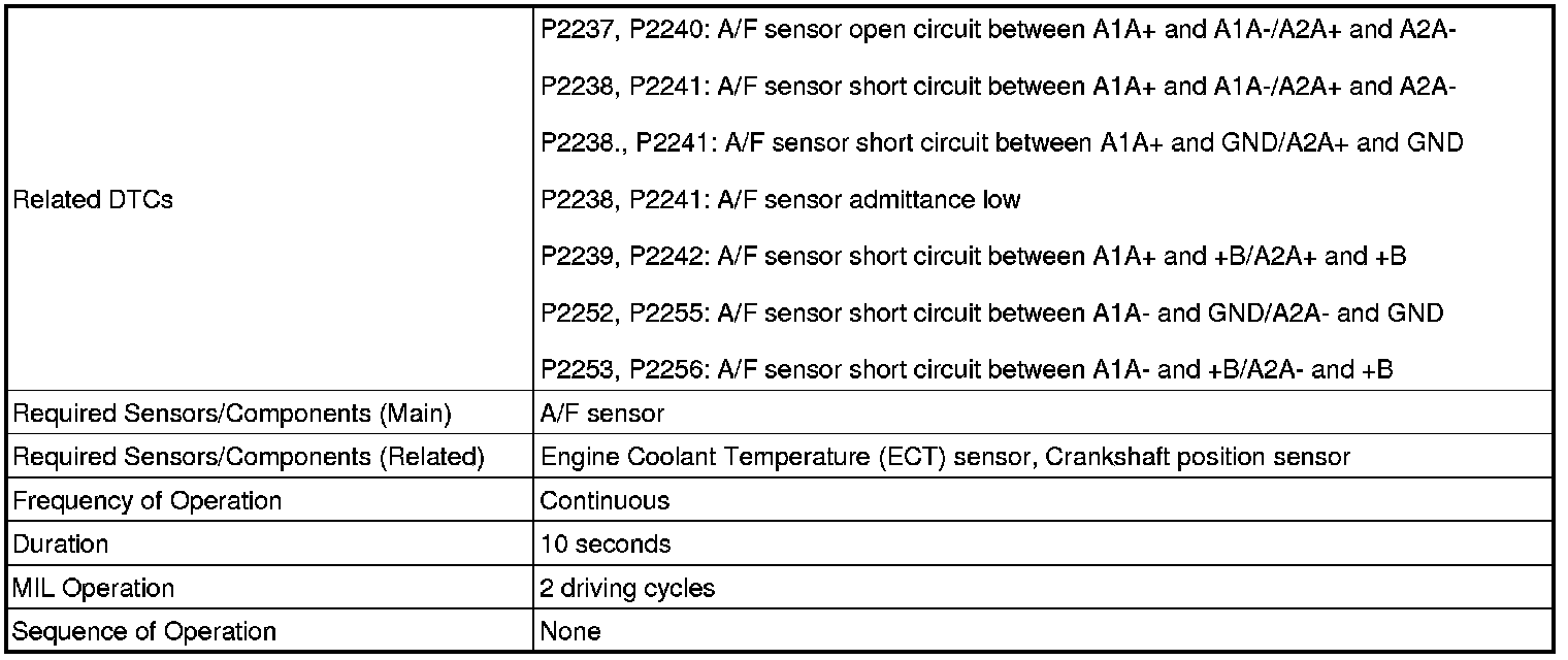 - Although the DTC titles say oxygen sensor, these DTCs relate to the Air-Fuel Ratio (A/F) sensor.