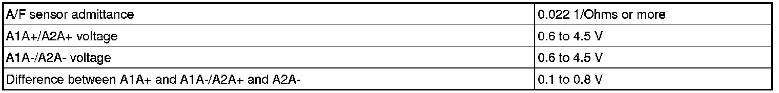 These DTCs are output when there is an open or short in the A/F sensor circuit, or if A/F sensor output drops. To detect these problems, the voltage of the A/F sensor is monitored when turn the engine switch on (IG), and the admittance (admittance is an electrical term that indicates the ease of flow of current) is checked while driving. If the voltage of the A/F sensor is between 0.6V and 4.5V, it is considered normal. If the voltage is out of the specified range, or the admittance is less than the standard value, the ECM will determine that there is a malfunction in the A/F sensor. If the same malfunction is detected in next driving cycle, the MIL will be illuminated and a DTC will be stored.
