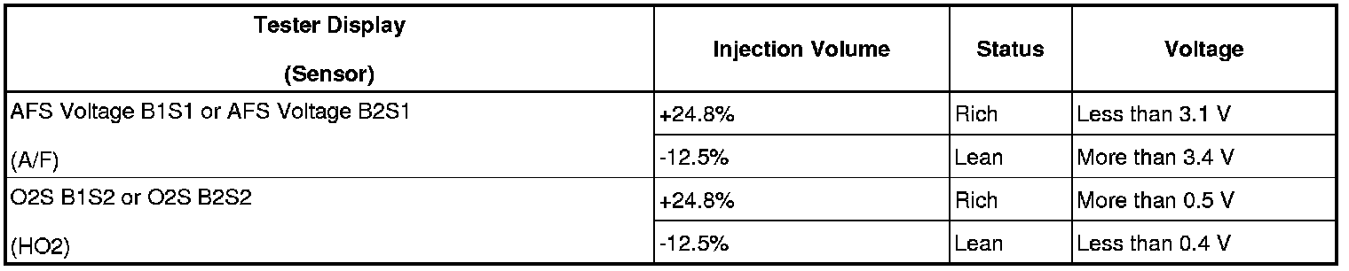 Malfunctioning areas can be identified by performing the Control the Injection Volume for A/F Sensor function provided in the Active Test. The Control the Injection Volume for A/F Sensor function can help to determine whether the Air-Fuel Ratio (A/F) sensor, Heated Oxygen (HO2) sensor and other potential trouble areas are malfunctioning.