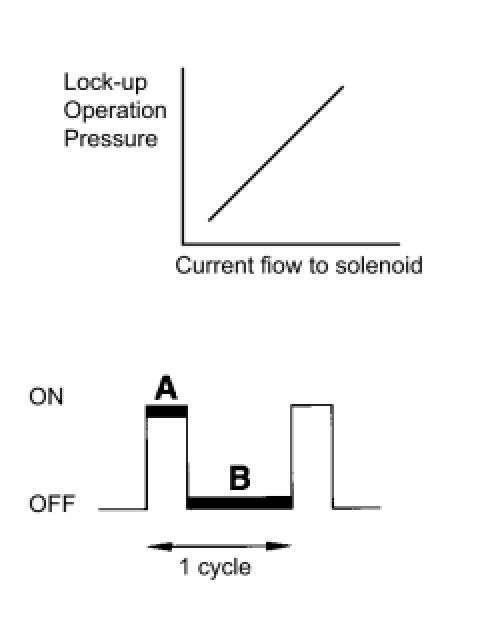 The amount of current flow to the solenoid is controlled by the (*) duty ratio of the ECM output signal. The higher the duty ratio becomes, the higher the lock-up hydraulic pressure becomes during the lock-up operation.