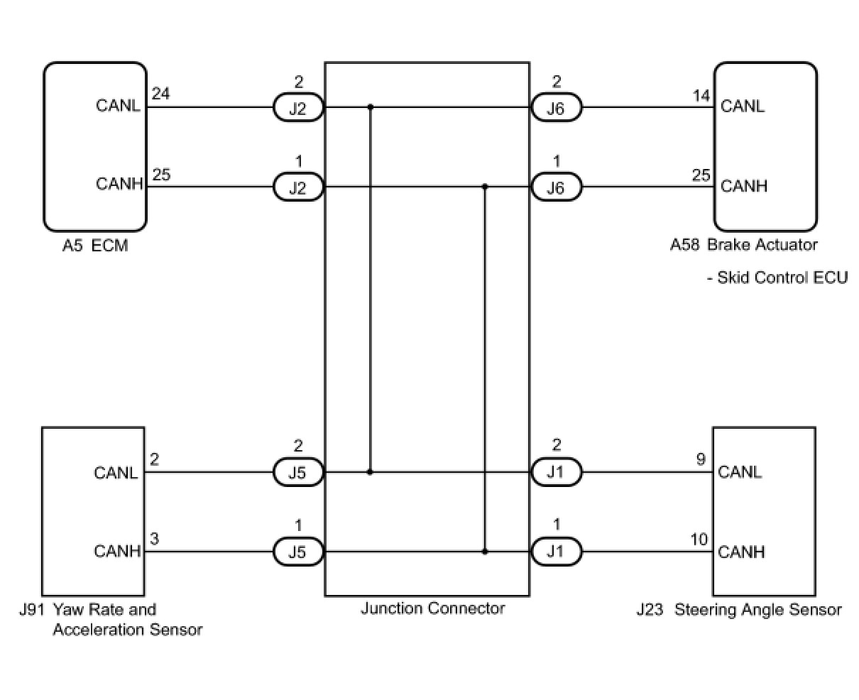 The skid control ECU receives signals from the ECM, steering angle sensor, and yaw rate and acceleration sensor via the CAN communication system.