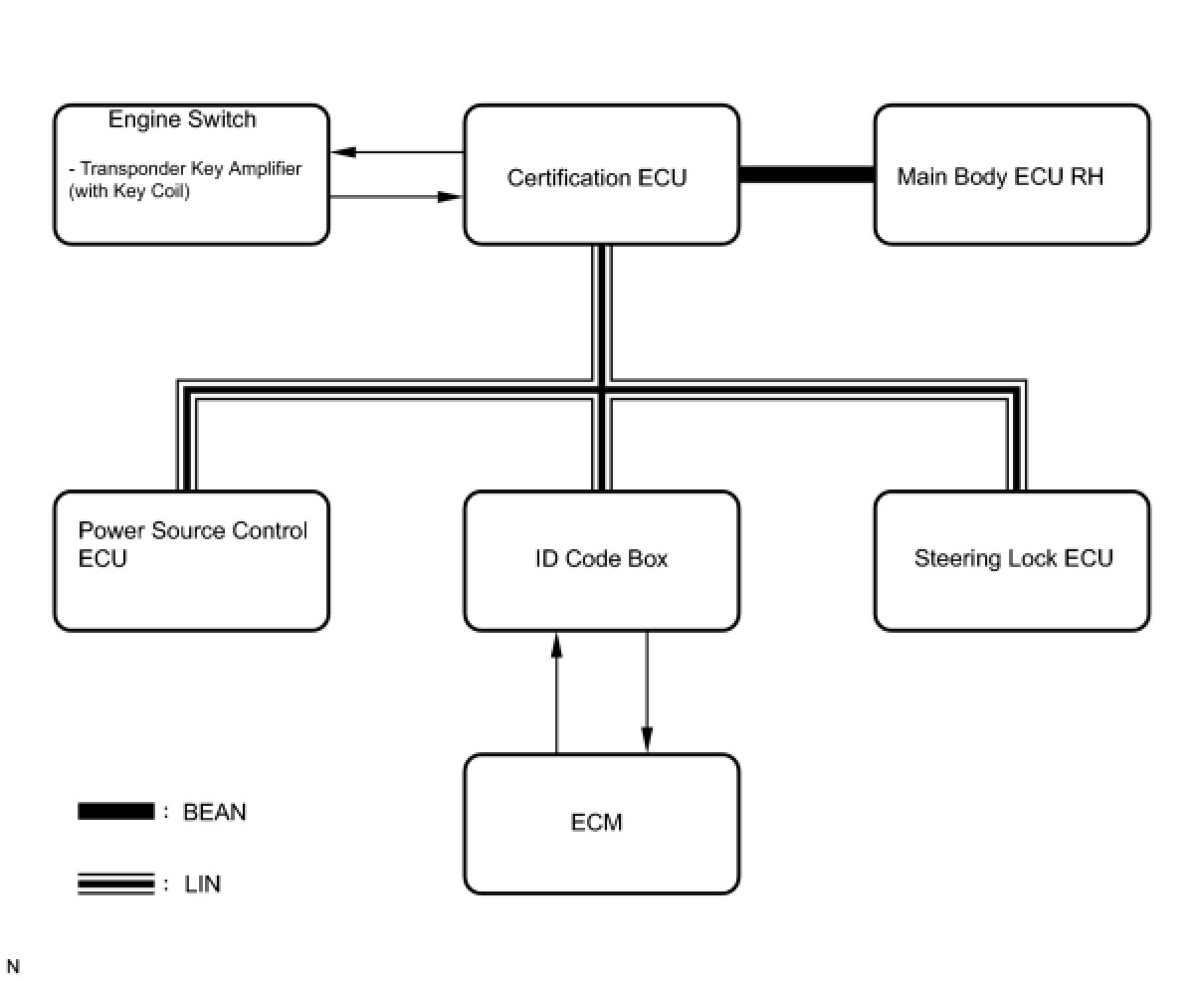 (1) When the driver (or passenger) is sitting in the vehicle while carrying the key, and the engine switch is pressed while the brake pedal is depressed, the power source control ECU recognizes that the engine start operation has occurred and sends a certification request signal to the certification ECU. Upon receipt of the certification request signal, the certification ECU sends a request signal to the indoor electrical key oscillator. Upon receipt of the request signal, the indoor electrical key oscillator sends a request signal to detect if the key is inside the vehicle. When the key receives this request signal, it answers by sending an ID code containing a response code through the glass antenna to the door control receiver. Upon receipt of the ID code, the certification ECU analyzes the code. If the interior certification passes, then the power source control ECU sends a certification pass response signal. When the power source control ECU receives this signal, the ACC relay is switched on and the IG1 and IG2 relays are switched on in sequence. At this time, the engine switch indicator illuminates in green. Then the certification ECU checks that the power source mode has been changed and sends a steering lock command signal to the power source control ECU. After receiving this signal, the power source control ECU supplies power to the steering lock actuator. Then (via the ID code box) the steering lock ECU confirms that the certification ECU is certified and drives the steering actuator's motor until the steering lock is unlocked. After unlocking the steering lock, an unlock completed signal is sent to the certification ECU. Upon receipt of this signal, the certification ECU sends an unset command signal to the ID code box. Once this signal is received, the ID code box confirms that the certification ECU is certified, sends an immobilizer unset command signal to the ECM and sends a security indicator light off signal to the main body ECU RH.
