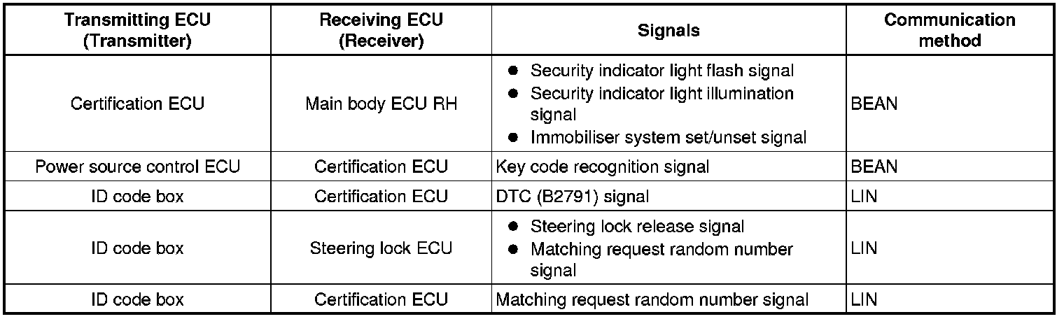 (a) The immobilizer system is a theft deterrent system that determines whether to disable starting of the SFI system based on a comparison of the key's ID code and the vehicle's pre-registered code. The immobilizer system compares the vehicle certification ECU's pre-registered ID code with the ID of the key-embedded transponder chip. If the ID codes do not match, the immobilizer system activates and the SFI system cannot be started. The certification ECU manages communication with the ECM, power source control ECU, steering lock ECU and ID code box. When the ID codes of the transponder chip and certification ECU match, the certification ECU authorizes the starting of the SFI system.
