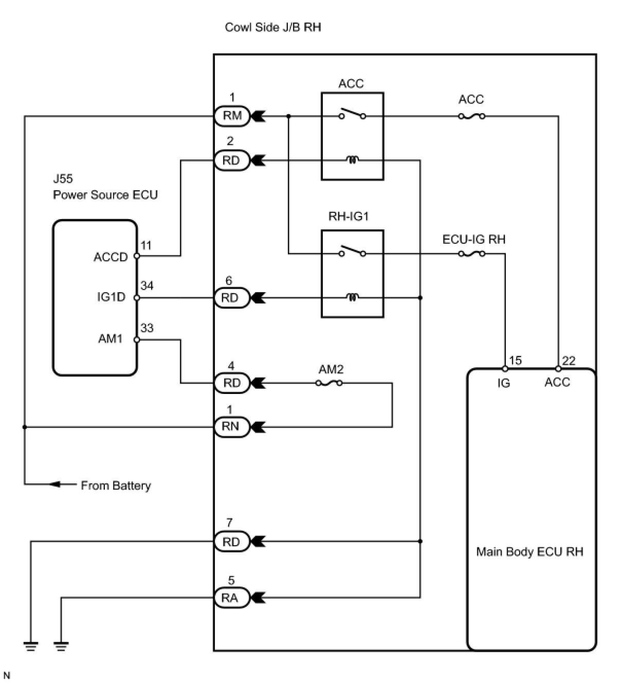 When the engine switch is turned on (IG), positive (+) battery voltage is applied to the main body ECU RH (cowl side J/B RH). When battery positive (+) voltage is applied to terminal IG of the main body ECU (cowl side J/B RH) while the theft deterrent system is operating, the warning stops.