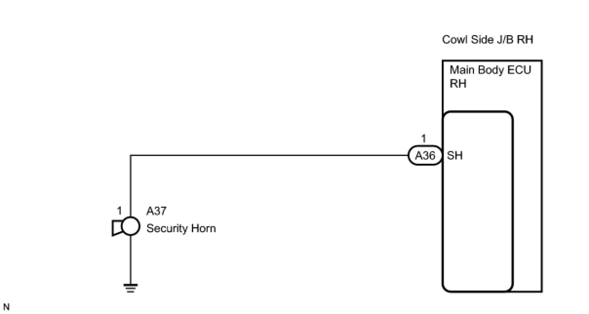 When the theft deterrent system is operating, the relay in the main body ECU RH turns on and off, causing the security horn to sound.