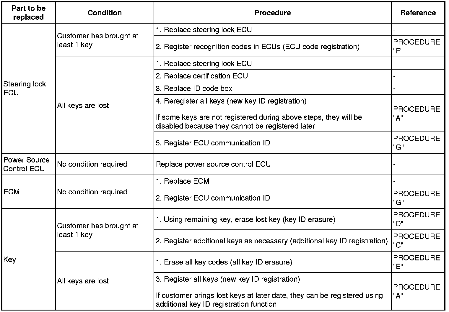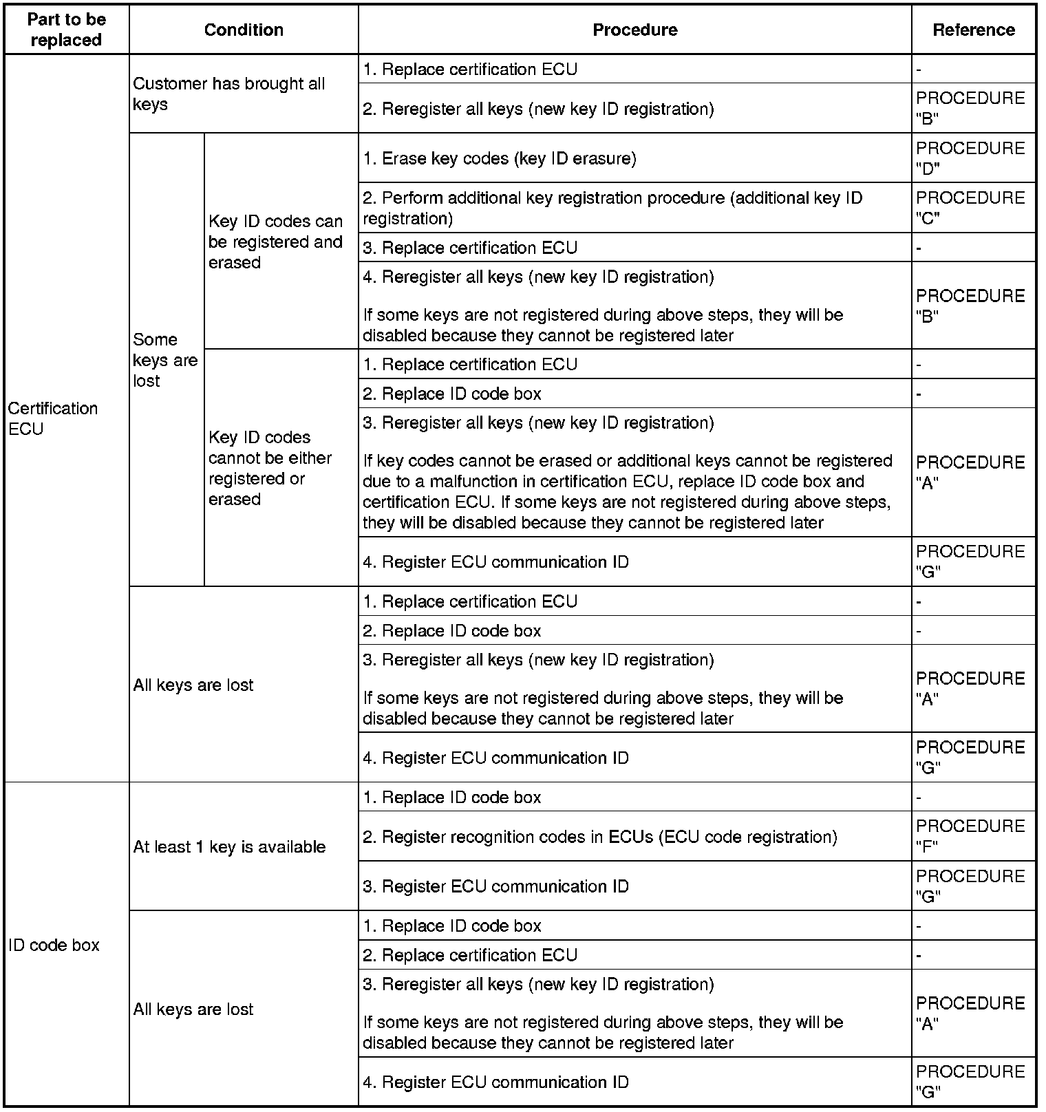- Code registration is needed when the certification ECU, ID code box, steering lock ECU or key is replaced with a new one.