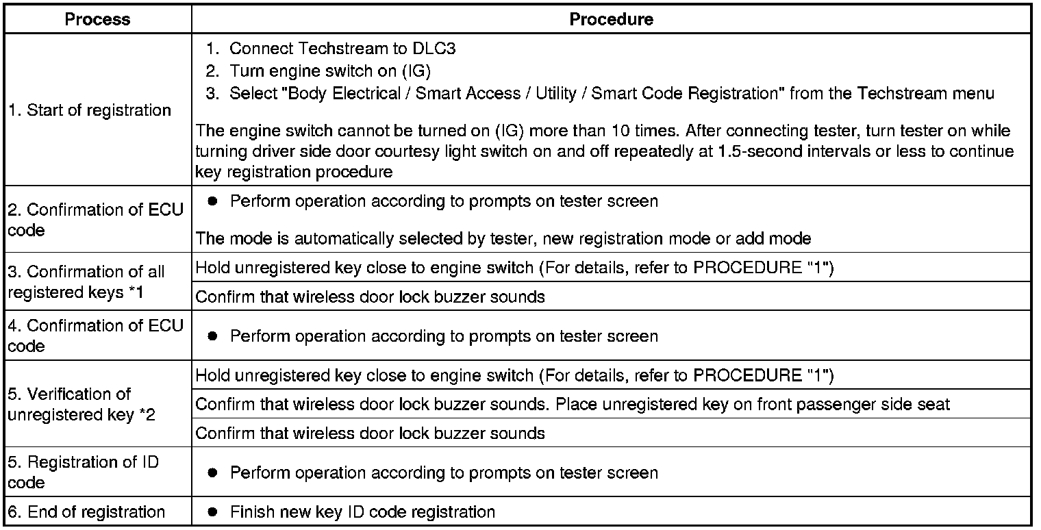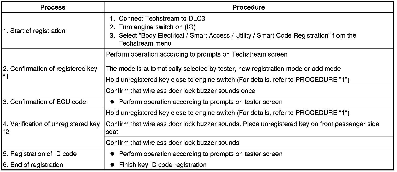 - *1: Perform this process for one of the keys registered for the vehicle. Finish the procedure within 30 seconds. If the procedure has not been finished within the specified time, perform registration procedures from process 1 again.