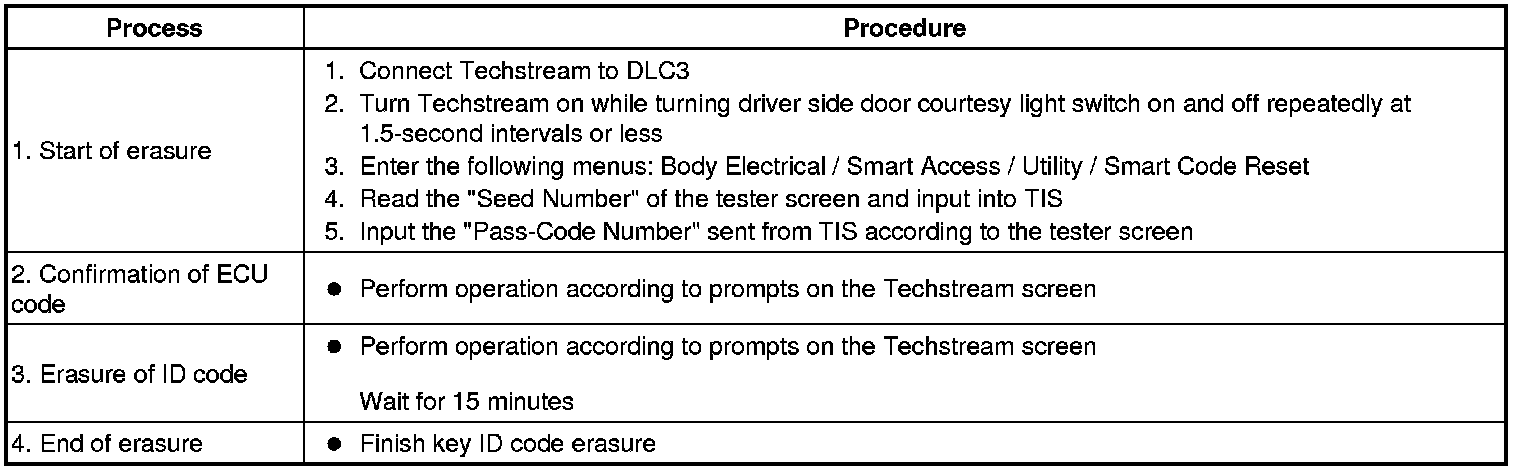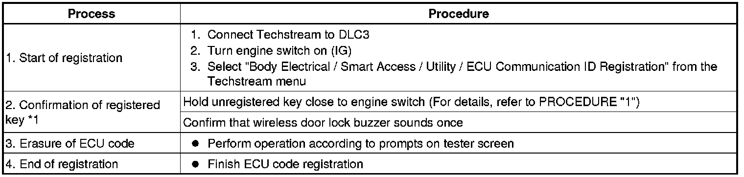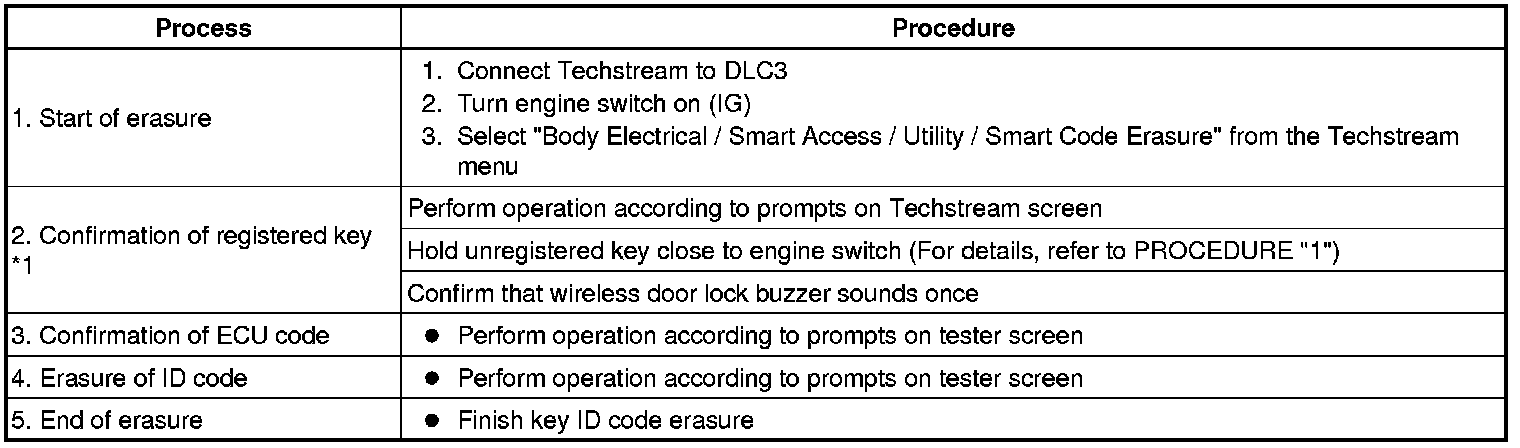 - *1: Perform this process for one of the keys registered for the vehicle. Finish the procedure within 30 seconds. If the procedure has not been finished within the specified time, perform erasure procedures from process 1 again.
